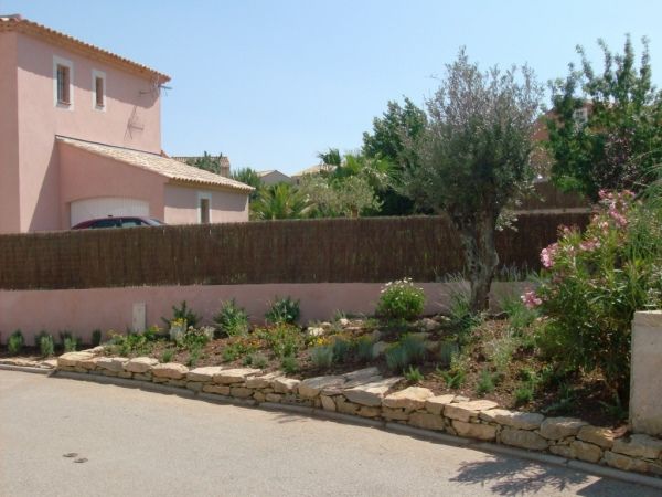 Introduire un mur en pierres sèches en lieu et place de ces murs bétonnés permet de retrouver un coté minéral au milieu de la végétation.